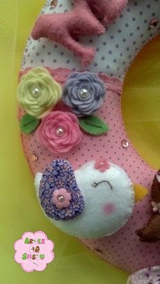 A guirlanda tem a medida de 28 cm diâmetro confeccionada com feltro e tecido 100% algodão.